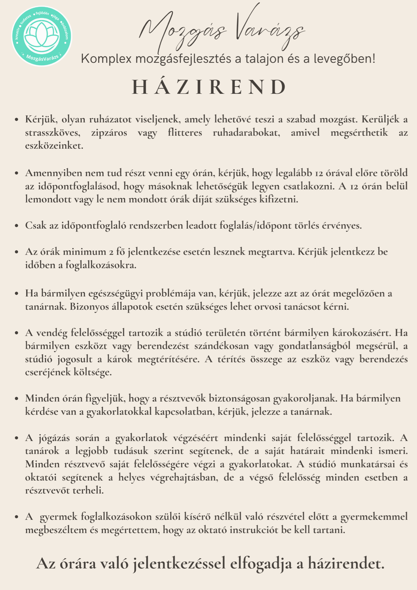 A foglalkozások alatt készített fényképeket a Mozgás Varázs Stúdió a közösségi oldalaira hirdetési célból feltölti. Ha ebbe nem egyezik bele, akkor jelezze a beiratkozási lapon vagy az oktatónak. Természetesen tiszteletben tartjuk a döntését. Köszönettel : Mozgás Varázs!